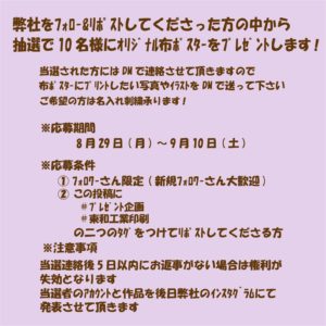 インスタグラムで弊社をフォロー&リポストしてくださった方の中から抽選で10名様に布ポスターをプレゼントします!!